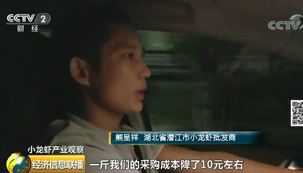 湖北省潜江市小龙虾批发商 熊呈祥:收中青(单只重量在4到6钱规格的青壳小龙虾)价格在16元/斤左右,比去年同期采购成本每斤要低10元,最少便宜30%以上。