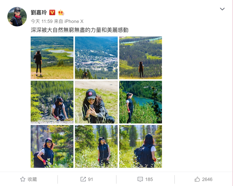 8月7日,刘嘉玲在微博上晒出自己出游的照片,并配文写道:“深深被大自然无穷无尽的力量和美丽感动。”照片中,刘嘉玲穿着黑色运动马甲搭健身裤,背上背着硕大的旅行包,十足的登山客风范。刘嘉玲不时停下脚步,眺望远山,或是驻足脚步,捕捉大自然的美景。