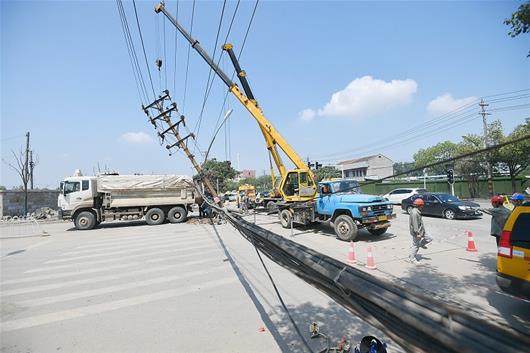 楚天都市报讯(记者满达萧颢实习生沈志豪杨莉)昨日凌晨4时许,在武汉市江岸区谌家矶大道长江明珠小区附近,一辆渣土车尾部挂上电线杆上的通信线缆,将电线杆扯断,电力工人头顶烈日紧急抢修。
