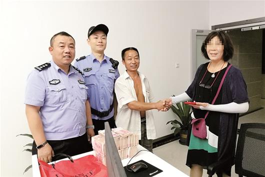 图为:郑学明(右二)在派出所将钱还给失主施女士