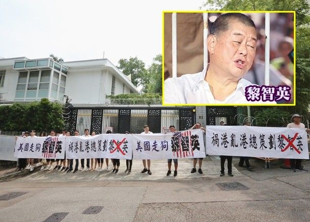 20人赴黎智英住所外拉横幅斥其“美国走狗”,高喊“滚出香港”。