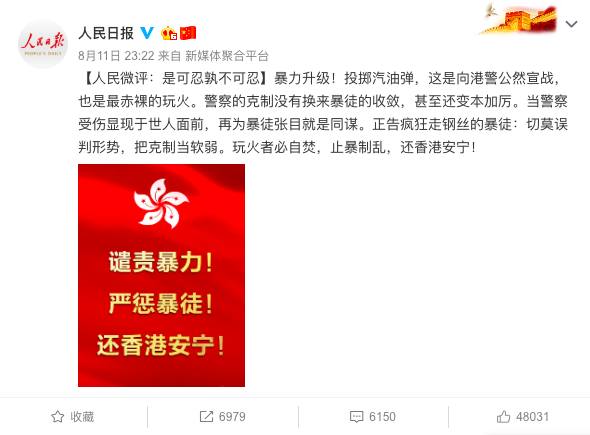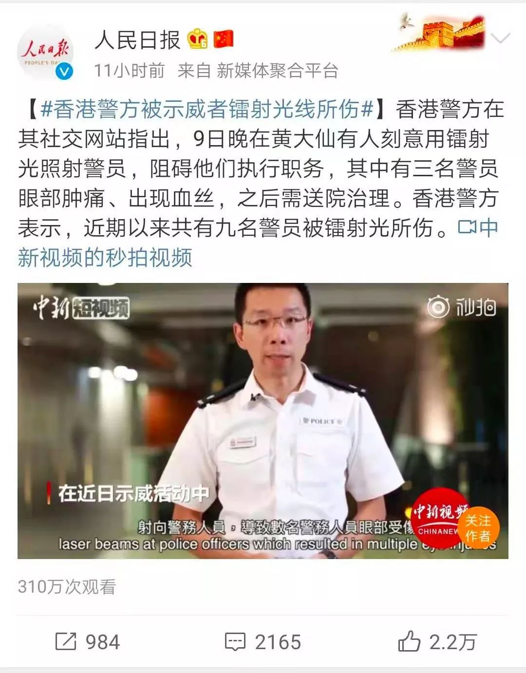 针对香港发生多起暴徒用汽油弹袭警事件,@人民日报评论称↓↓↓