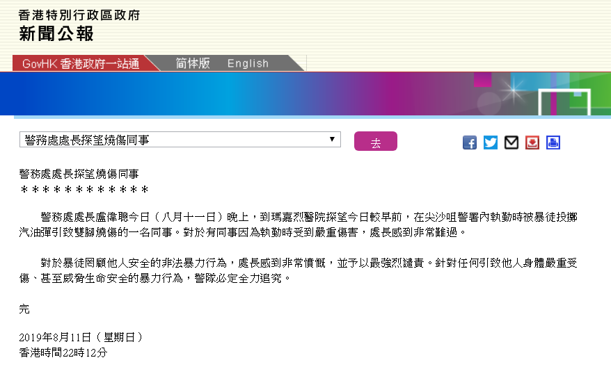 另据环球时报报道,昨晚,香港政府公布的消息称,11日,有一名香港警察在尖沙咀警署内执勤时,被暴徒投掷汽油弹引致双脚烧伤,目前正在玛嘉烈医院治疗。