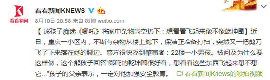 [ 熊孩子痴迷《哪吒》将家中杂物高空扔下:想看看飞起来像不像乾坤圈]近日,重庆一小区内,不断有杂物从楼上抛下,保洁正准备打扫,突然又一把剪刀飞了下来落在她的脚边。警方很快找到肇事者:22楼一小男孩。被问及为什么要这样做,这个熊孩子回答“哪吒的乾坤圈很好看,想看看这些东西飞起来像不像它。。。”孩子的父亲表示,一定对他加强安全教育。