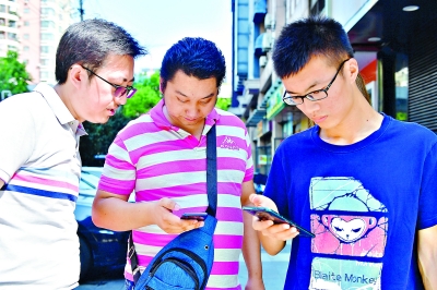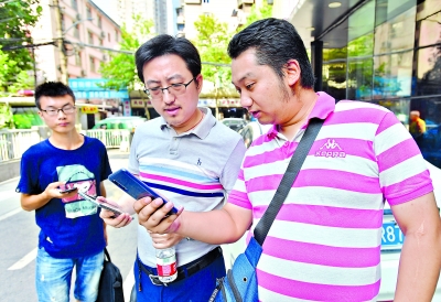 12日,武汉的邹先生(右一)带着5G手机,来到京汉大道单洞三路路口,现场体验5G网络,感叹:“有了5G之后,发现4G真是慢了。”