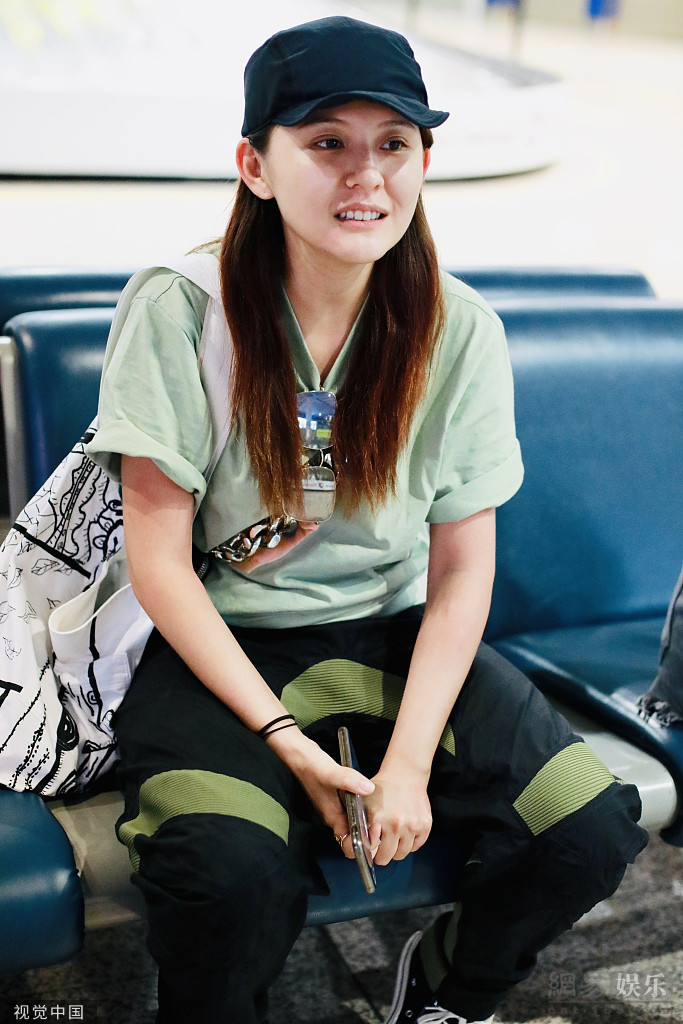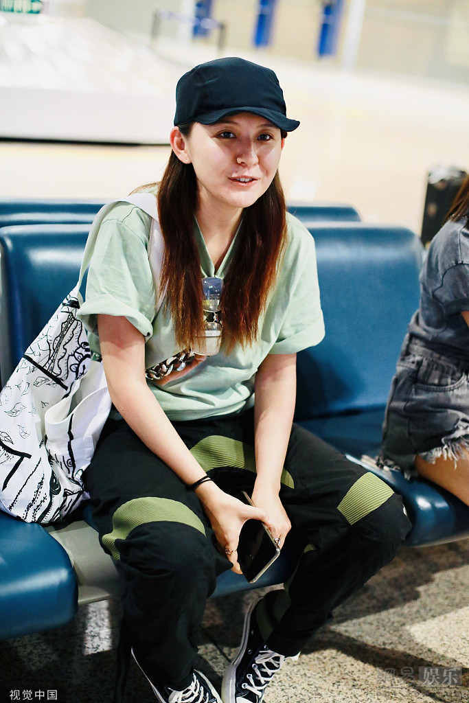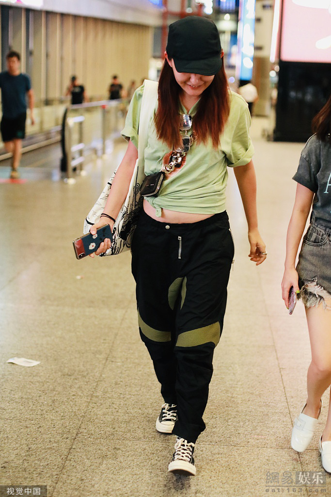 2019年8月12日,北京,热依扎现身机场。她穿绿T配黑裤走酷帅风,下摆打结露腰显穿搭小心机,双手合十谦逊有礼,机场频打哈欠难掩困意