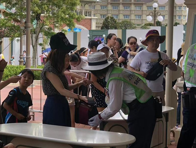 东京迪士尼乐园入口,工作人员正在进行安检。安检人员基本以手触包体外部以及目测包内物品为主。孙璐 摄
