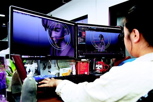 图为:8月13日,武汉两点十分文化传播有限公司的建模师正在建立模型。