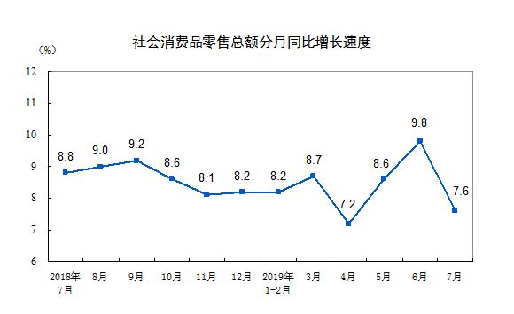 数据显示,7月份社会消费品零售总额33073亿元,增速比上月回落2.2个百分点。