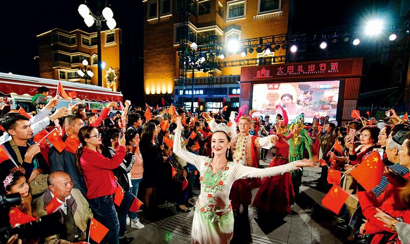新疆国际大巴扎是新疆商业与旅游繁荣的象征,集建筑、民族商贸、娱乐、餐饮于一体,是新疆旅游业产品的汇集地和展示中心,是“新疆之窗”。图为2018年10月1日,在乌鲁木齐新疆国际大巴扎步行街,歌舞演员和游客一起载歌载舞,欢度国庆。 新疆维吾尔自治区党委宣传部供图