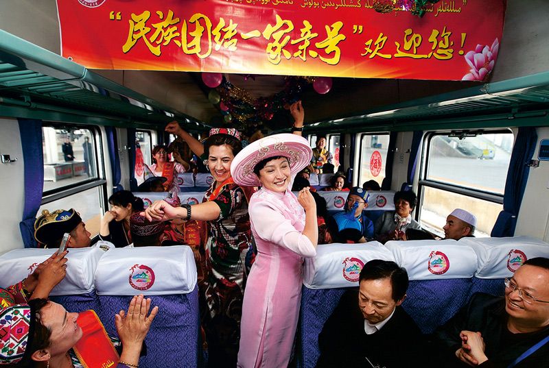 2017年,新疆开通从乌鲁木齐到和田、从北疆到南疆的特快旅客列车“民族团结一家亲号”,架起了一座各民族群众交往交流交融的“连心桥”。图为2017年4月11日,各族旅客从高铁新客站乘坐“民族团结一家亲号”专列出发,大家在车上跳起了麦西来甫。 新疆维吾尔自治区党委宣传部供图