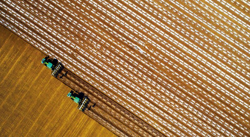 今日之新疆,农业综合生产能力和现代化装备水平大幅提高,靠天吃饭已经成为历史。图为2018年4月15日,玛纳斯县乐土驿镇三岔口村,绿源农业合作社6700亩棉花陆续开播,卫星导航无人驾驶拖拉机在地里精准作业。 新疆维吾尔自治区党委宣传部供图