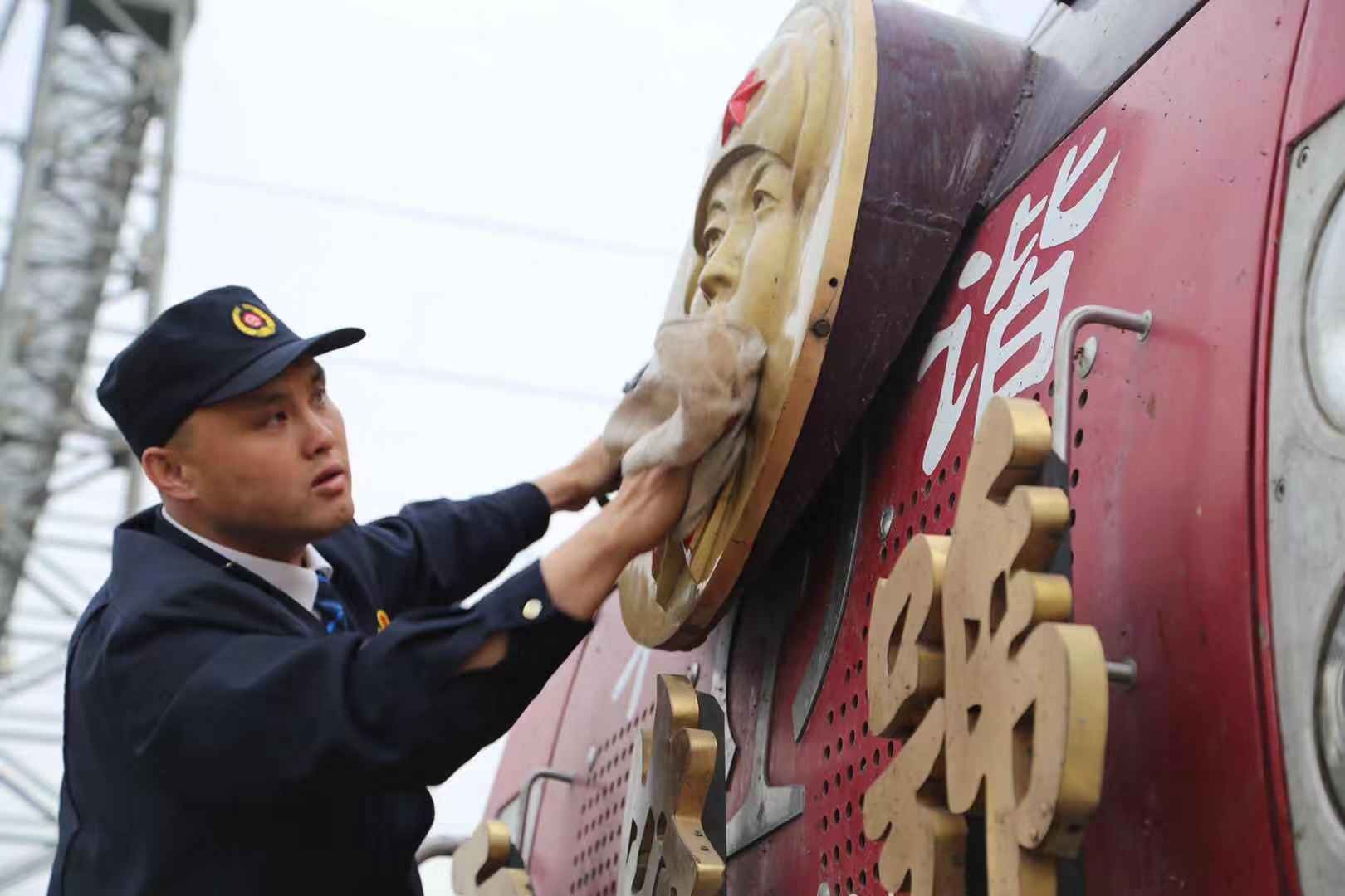 “雷锋号”机车组司机郝杰在擦拭雷锋头像(张玫 摄)