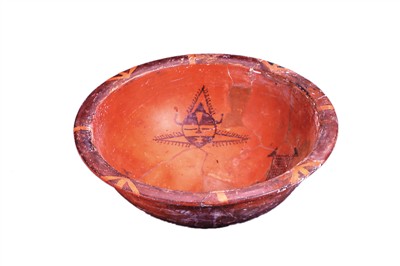 人面网纹彩陶盆高17厘米、口径45厘米,卷唇、平底、鼓腹,整体呈橘红色。陶盆内壁用黑彩绘有人面网纹图案,人面与网纹均相互对称。人面为圆球形,头顶有三角形发髻,发髻上有三角形尖锥物。两只眼睛用一字横纹表示,似在闭目养神。鼻部呈三角形,耳部外伸上翘,嘴型似线轴,嘴角两侧有带短线的长三角。