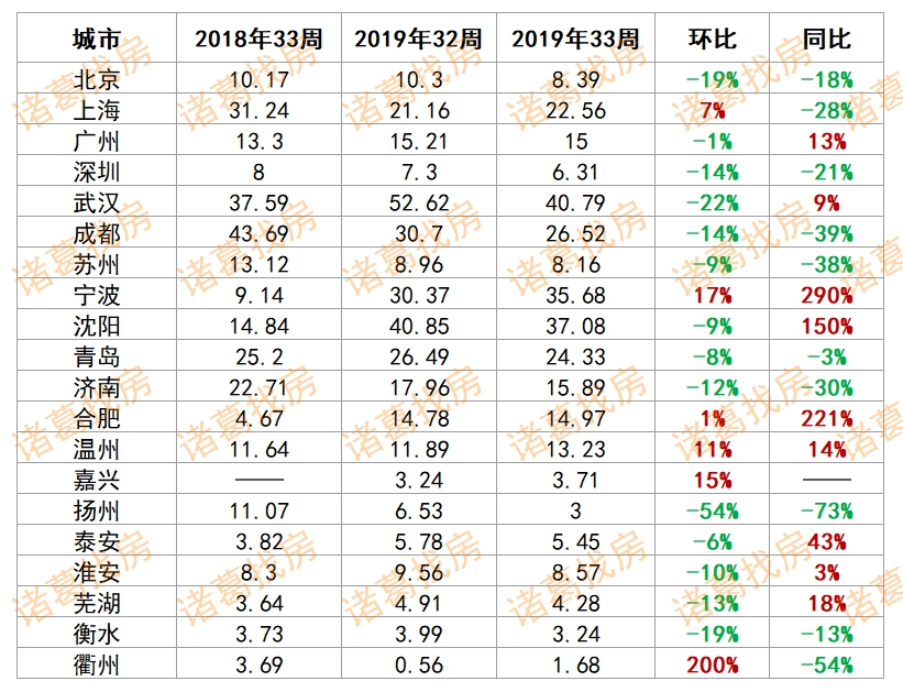 报告显示,第33周,重点监测的20城市新房销售面积环比下降7.5%,比上月降幅收窄3.5个百分点,其中仅6城市成交环比上升;与去年同期相比,20城销售面积上升6.5%,其中9城市同比上升。