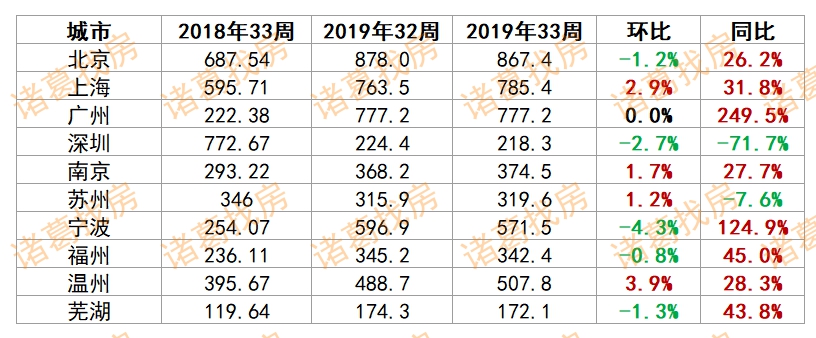 第33周各城市库存面积监测 单位:万㎡ 数据来源:各地住建委、房管局,诸葛找房