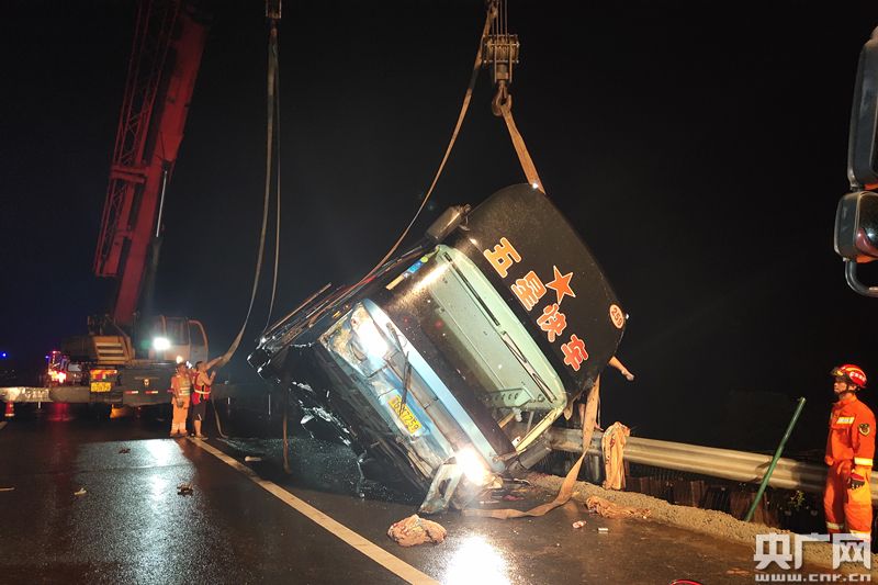 广东大巴高速侧翻致7死11伤 车身悬空多人被困