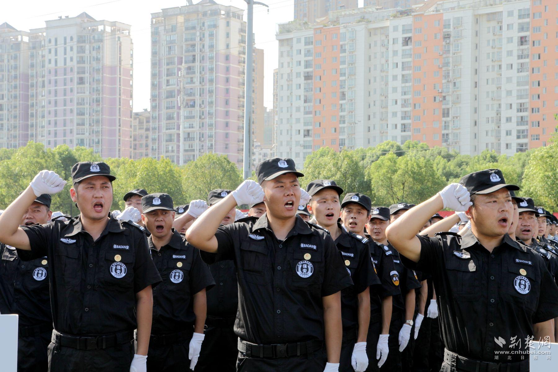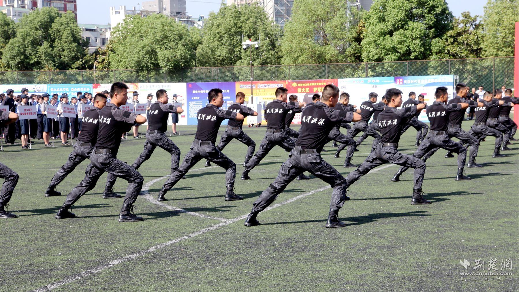 在当天的宣誓动员大会上,来自武汉洪保、武汉纵横、天蓝鹰、同宁等4家保安公司的保安员现场演练汇报了擒敌术、轨道交通突发事件应急处置、警棍盾牌操及消防水带抛接等全市保安教育练兵训练科目。
