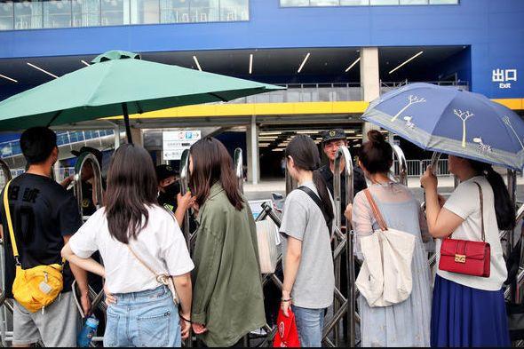 9点56分,太阳高照,商场外侧人群聚集,不少市民撑伞在路边排队等待。