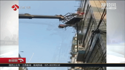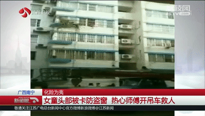 正当大伙一筹莫展时,一辆吊车开了过来,吊篮上还站着一名男子。男子小心翼翼撑开防盗网,成功将女孩推回屋内。