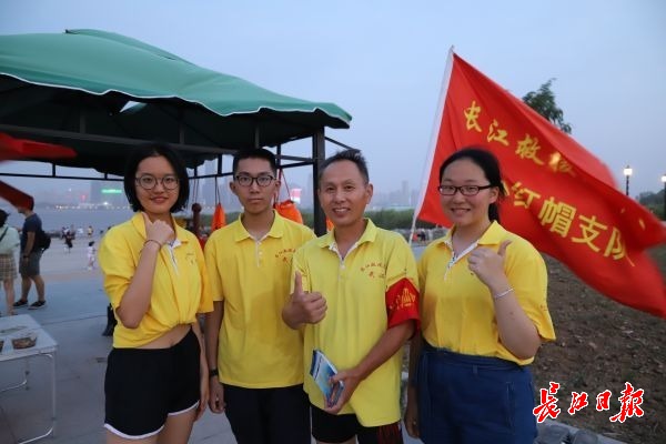 汤麟和汤皓栋父子俩在汉口江滩三阳路广场和长江救援队小红帽支队年轻的队员艾思屹、王小芃在一起值班。 记者杨涛 实习生朱可嫣 摄