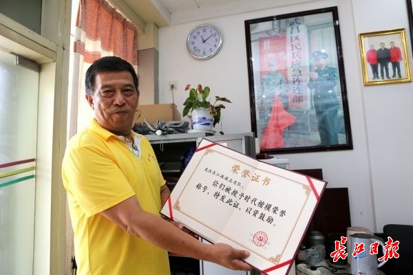 武汉长江救援志愿队队长张建民,展示长江救援志愿队获得2015年中宣部授予的“时代楷模”荣誉称号证书。 记者杨涛 实习生朱可嫣 摄