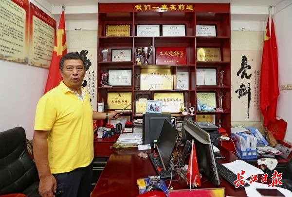 武汉长江救援志愿队队长张建民展示团队获得的各项荣誉。 记者杨涛 实习生朱可嫣摄