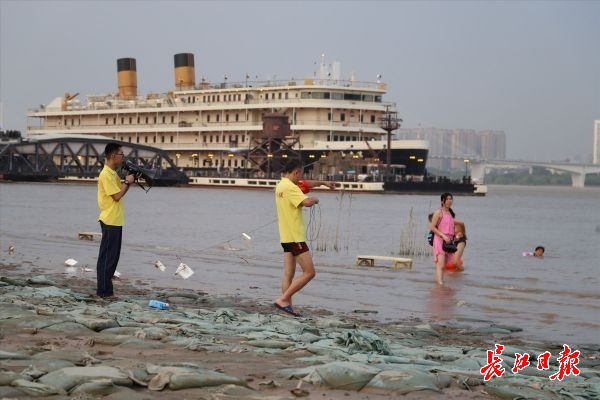汤麟和汤皓栋父子俩在汉口江滩三阳路广场江边全,劝阻市民不要到深水区域游泳。 记者杨涛 实习生朱可嫣 摄