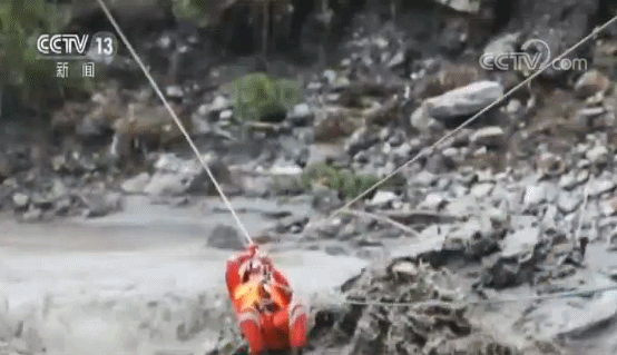 在对岸群众的配合下,一名战士横渡过河,并在对岸加固支点,搭建救援系统,接下来,转移两名病人,其中一人脊椎发炎,下身无法行动。