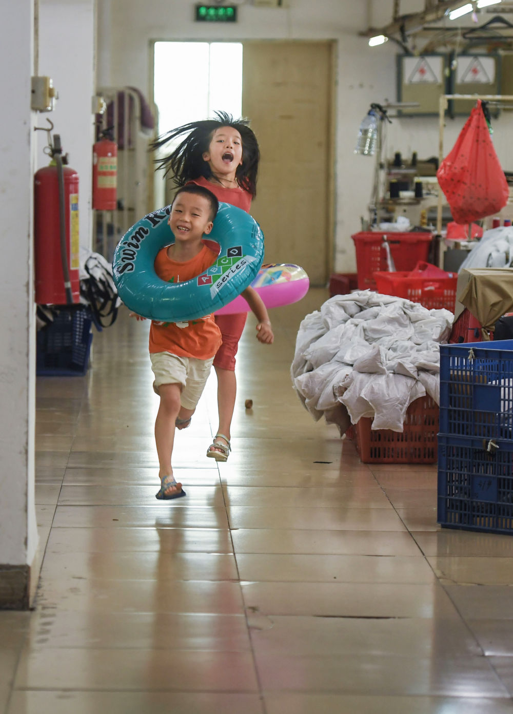 在服装厂车间,卢嫦莉、卢彭瀚姐弟套着游泳圈在玩耍。