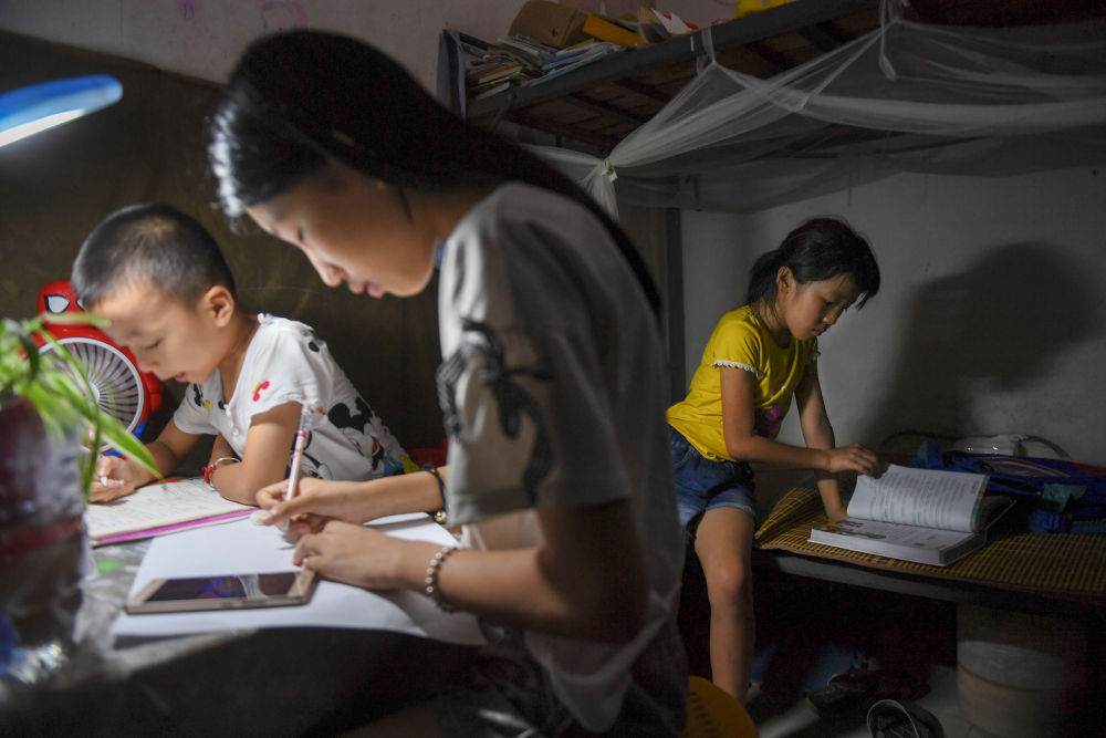 在福建石狮的一家服装厂宿舍,卢嫦莉(右)、卢彭瀚(左)姐弟和他们的表姐刘磊看书学习。