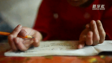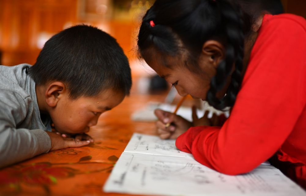 在青海沙柳河镇果洛藏贡麻村,角巴措(右)在邻居家小朋友的“监督”下写作业。