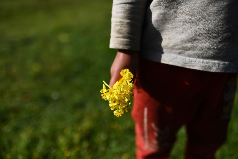 在青海沙柳河镇果洛藏贡麻村智和美沟,4岁的嘎特卓玛在草原上收集了一小把花,她的哥哥扎西东智可以用这种花吹出有趣的声音。