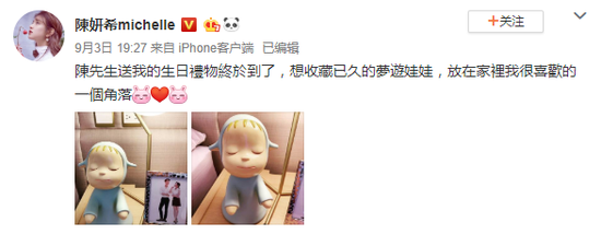 网易娱乐9月4日报道 9月3日,陈妍希在微博晒出两张梦游娃娃的照片,并发文称:“陈先生送我的生日礼物终于到了,想收藏已久的梦游娃娃,放在家里我很喜欢的一个角落。”照片中,摆在床头的两人的合影十分抢镜。据悉,陈晓与陈妍希因合作《神雕侠侣》结识,于2015年公布恋情,2016年领证结婚。