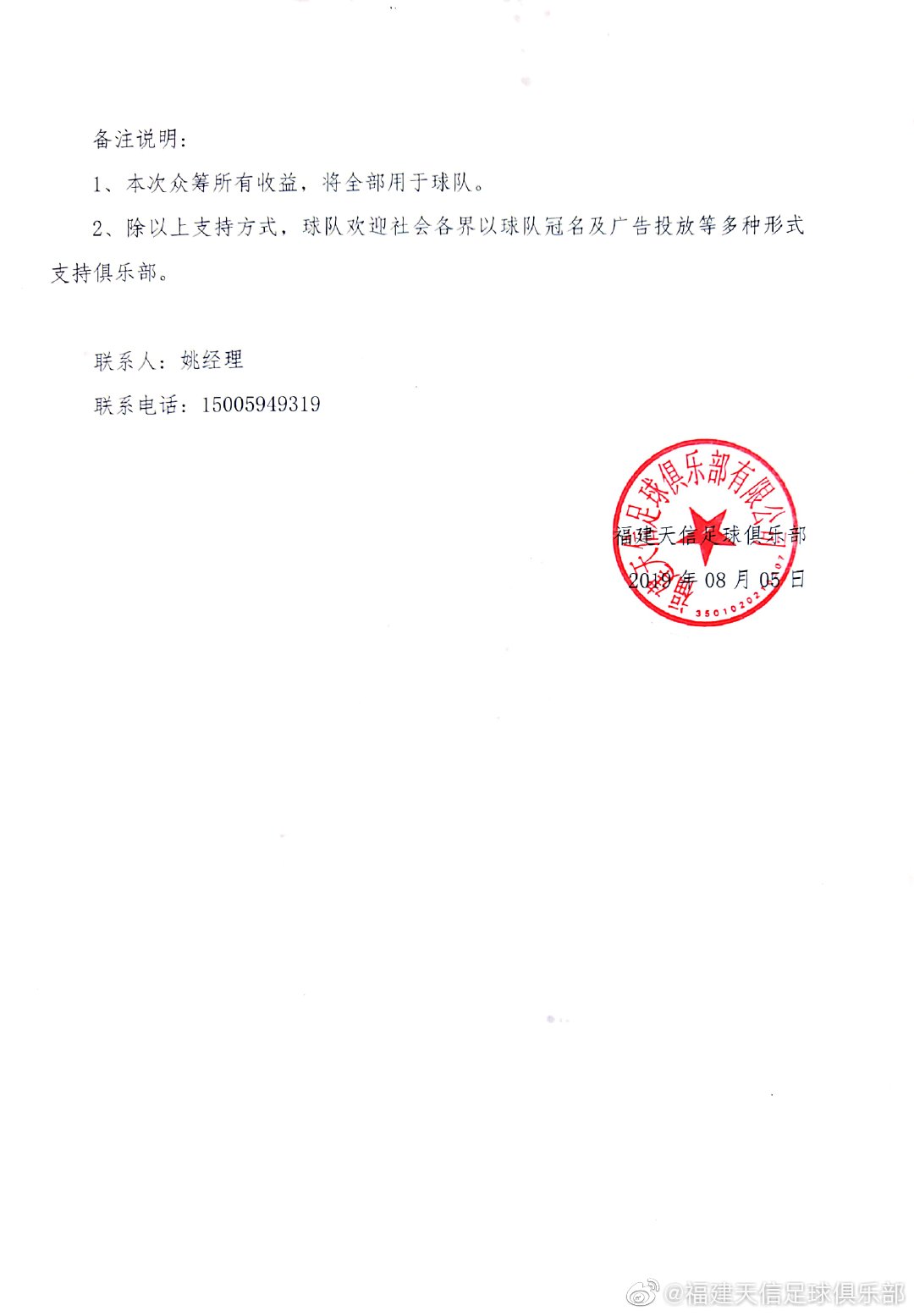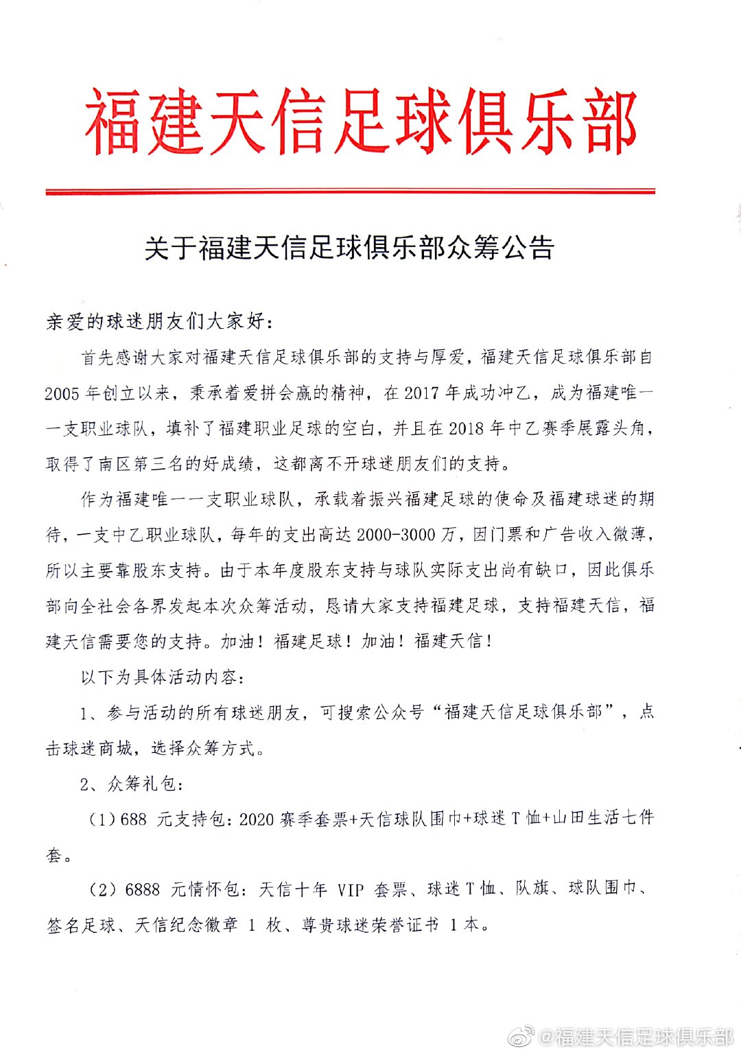 8月5日,天信俱乐部发布众筹公告,称“一支中乙职业球队,每年的支出高达2000-3000万,因门票和广告收入微薄,所以主要靠股东支持。由于本年度股东支持与球队实际支出尚有缺口,因此俱乐部向全社会各界发起本次众筹活动。”众筹公告发布后,有球迷担心,天信俱乐部可能会解散。(完)