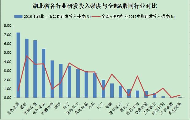 从研发投入强度来看,湖北上市公司中,有色金属行业以7.24%位居首位,位居其后的是通信、机械设备及电气设备行业,研发投入强度均超过5%,电子行业以3.49%的研发投入强度位居第7位。值得一提的是,相比去年同期,通信行业研发投入强度提升最为明显。