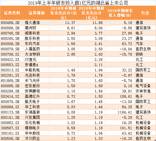 今年上半年,湖北研发投入超1亿元的上市公司共计23家,较去年同期增加4家。