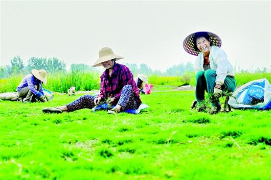 不远处,一片绿油油的草坪上,十多位村民正在拔除杂草。58岁的吴师傅告诉记者,她家的田地全都租出去了,她平时持家、种菜,闲时来这里打零工。