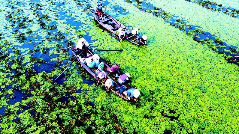 图为:8月30日,村民在湖面上采摘红菱。鄂州市梁子湖区涂家垴镇的涂镇湖破堤还湖后,万亩水面重返梁子湖,经过几年的休养生息,今年在野生莲子丰收的同时,野生红菱也布满湖面。初秋时节,村民们自发组团下湖采红菱,渔船在湖面上来回穿梭,好一幅水上采菱图。 (视界网 张宏斌 摄)