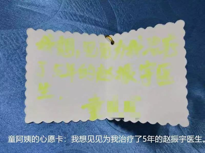 今年1月,肿瘤科率志愿者们为住院患者举办了迎新春联谊会,大家纷纷写下自己的新年愿望挂在心愿树上。童阿姨的愿望就是,想见见为她治疗了5年的赵振宇医生。