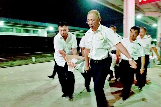 在车站忙着迎接引导救护车进站时,Z5次列车也缓缓驶入广水站。1时19分,列车停稳开门,石宝金已经和医生抬着担架和急救设备在车门前等候。