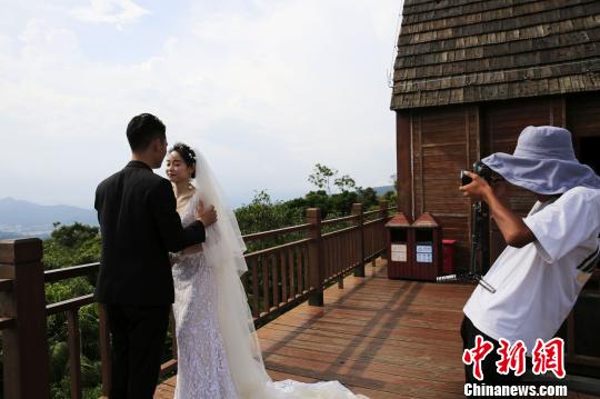 情侣在三亚亚龙湾热带天堂森林旅游区的山顶上拍摄婚纱照。 黄庆优 摄