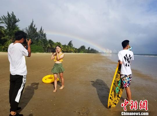 台风“杨柳”影响海南期间,三亚湾拍摄婚纱照的情侣以彩虹为背景摆造型。 王晓斌 摄