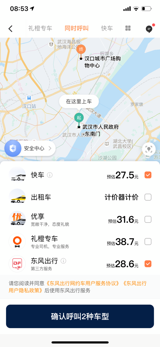 武汉用户通过滴滴App进入打车服务入口,选择同时呼叫,输入出行起始地址后,在页面下方就可以看到由第三方服务商“东风出行”提供的打车服务。滴滴出行方表示,上述服务目前还处于试运营阶段,本月底之前武汉用户将逐步可以使用。