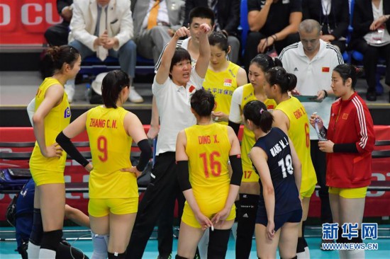 9月19日,中国队主教练郎平(左三)在比赛间隙指导球员。 当日,在日本横滨举行的2019年女排世界杯赛第一阶段A组循环赛比赛中,中国队以3比0战胜日本队。 新华社记者朱炜摄