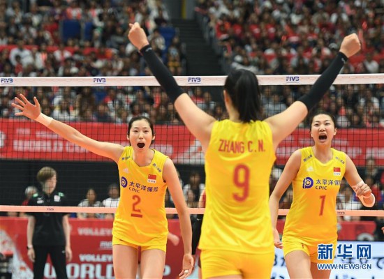 9月19日,中国队球员朱婷(左)、袁心玥(右)和张常宁在比赛中庆祝得分。 当日,在日本横滨举行的2019年女排世界杯赛第一阶段A组循环赛比赛中,中国队以3比0战胜日本队。 新华社记者贺灿铃摄