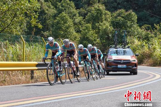 团体计时赛采用分时出发、分别计算耗时,再进行排名,需要队员之间的默契配合来保持高速骑行。 组委会供图