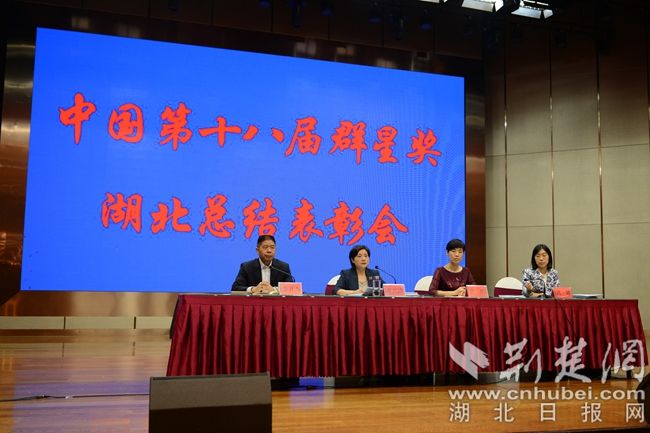 在中国第十八届群星奖湖北总结表彰会上,省群众艺术馆、荆州市文化和旅游局、宜昌市群众艺术馆、宜都市文化和旅游局、江陵阳光鹤艺教育、群文创作专家代表就群文创作作交流发言。文化和旅游部公共服务司负责人宣读文旅部评奖结果通报。李开寿宣读湖北省文化和旅游厅表彰通报,向获奖单位颁发了“群星奖”奖牌和奖金。