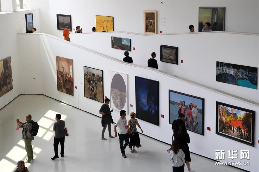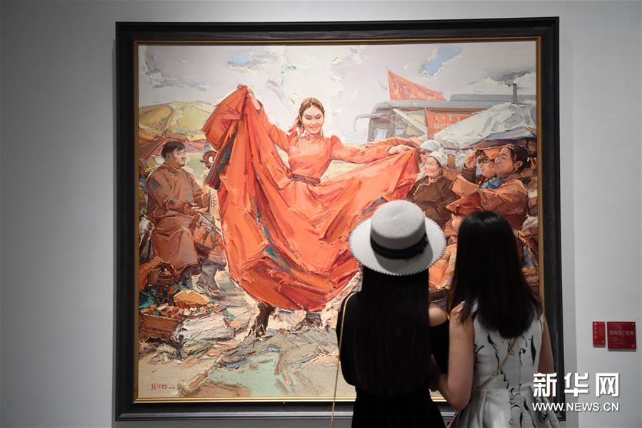 9月22日,观众在美术馆内参观油画作品《我的乌兰牧骑》。 当日,第十三届全国美术作品展览油画作品展在位于重庆大学城的四川美术学院美术馆开幕。 新华社记者 唐奕 摄