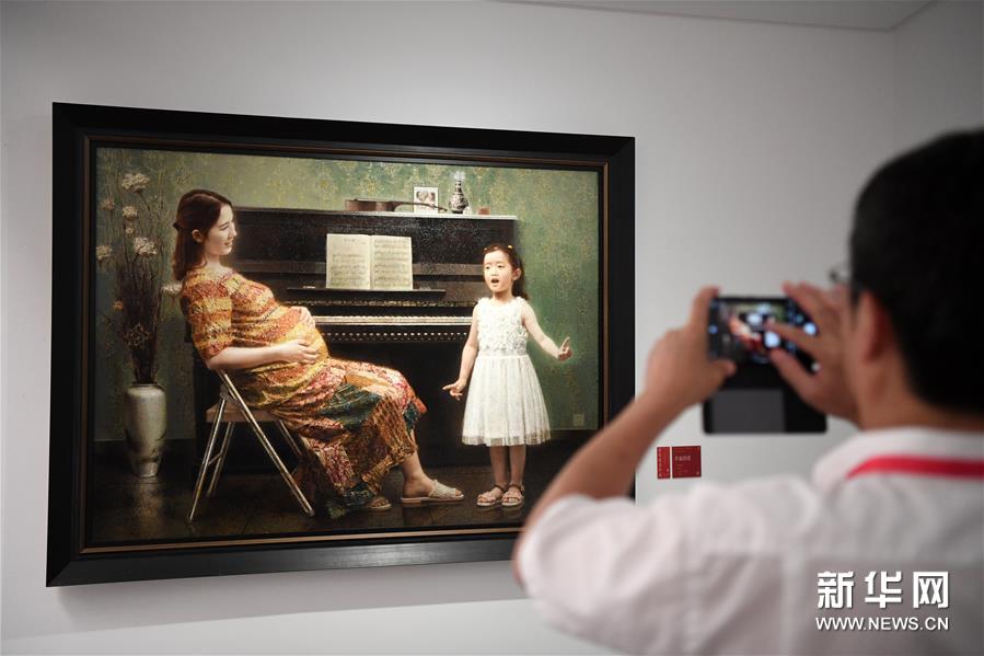 9月22日,观众在美术馆内参观拍摄油画作品《幸福的歌》。 当日,第十三届全国美术作品展览油画作品展在位于重庆大学城的四川美术学院美术馆开幕。 新华社记者 唐奕 摄